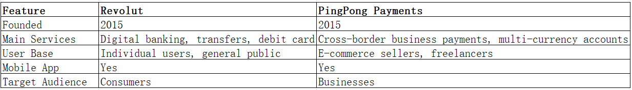 Revolut, founded in 2015, is a digital banking app offering currency exchange, international transfers, and debit card services to millions of users globally. PingPong Payments, established in 2015, focuses on cross-border payments for e-commerce sellers and freelancers, offering multi-currency accounts and fast payout options.