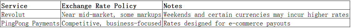 Exchange rate markups vary between the services. Revolut provides near mid-market rates for standard accounts, with slight markups on weekends or certain currencies. PingPong Payments offers competitive rates tailored for cross-border business payments.