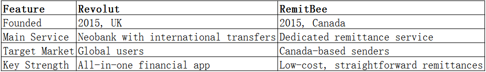 Revolut has a broader global reach, while RemitBee is regionally focused on Canada-based users.