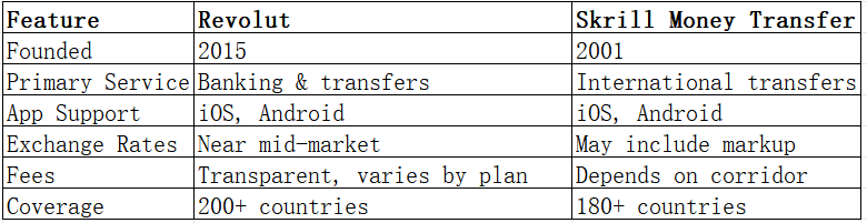 When comparing Revolut vs Skrill Money Transfer, both services are secure and convenient options for international money transfers. Revolut offers a broader range of financial tools and close-to-mid-market exchange rates, while Skrill provides global reach with a focus on online remittances.