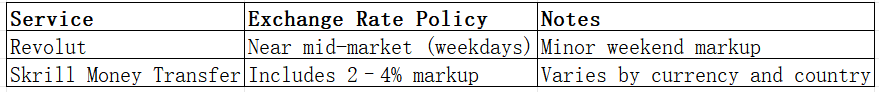 Revolut’s exchange rates are close to mid-market; Skrill may add markup.
