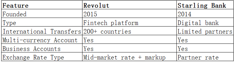 Revolut supports transfers to over 200 countries and 30+ currencies. Starling Bank has narrower reach but provides seamless GBP and EUR payments across Europe.