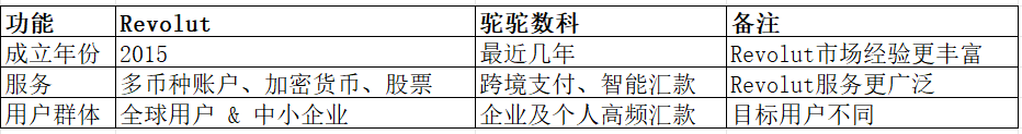 目标用户: Revolut面向全球消费者及中小企业,驼驼数科面向企业及高频汇款个人