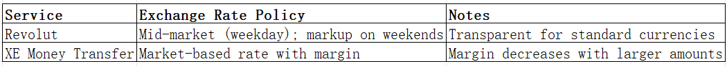 Revolut offers mid-market rates during weekdays, but applies a small markup on weekends or exotic currencies. XE uses live market data but applies its own margin depending on the transfer size.