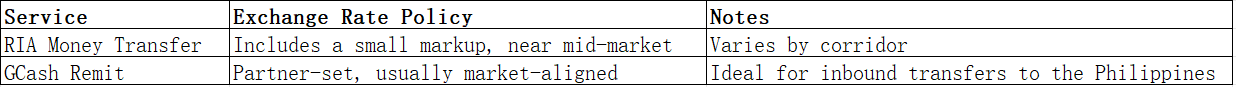 RIA’s fees vary by destination country, transfer amount, and payment method, usually consisting of a fixed fee plus a margin on the exchange rate. GCash Remit supports zero receiving fees for some inbound transfers to the Philippines, though sending fees may be charged by partners.
