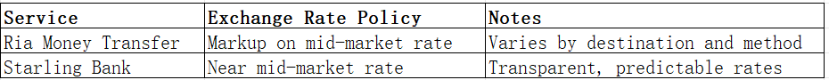 Ria applies a markup on the mid-market exchange rate, varying by corridor. Starling Bank provides near mid-market rates with full transparency, ideal for frequent digital users.