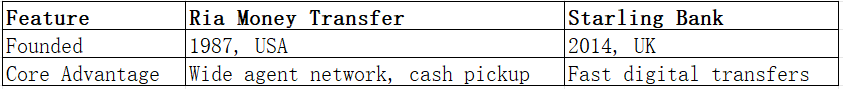 Ria offers cash pickup, bank deposits, and mobile wallet options, with delivery times ranging from minutes to 1–3 business days. Starling Bank focuses on instant digital transfers and seamless app usability.