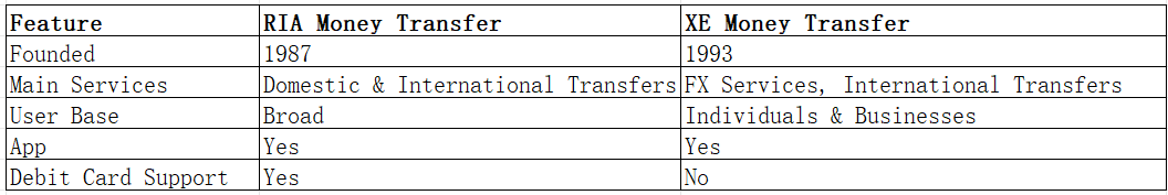 RIA transfers can be instant to several days depending on the method, whereas XE transfers usually take 1–2 business days online. Both services provide apps and online portals for convenience.