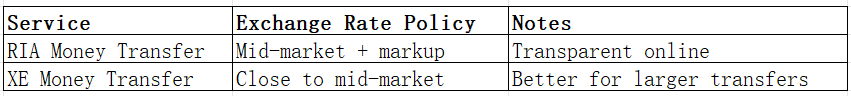 Exchange rates can significantly impact total transfer costs. RIA applies a modest markup on mid-market rates, while XE Money Transfer typically offers rates closer to mid-market for larger transactions.