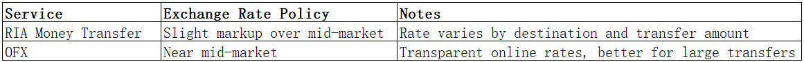 RIA Money Transfer applies a modest markup on exchange rates, which can affect smaller transfers. OFX offers near mid-market rates, particularly favorable for larger amounts. PandaRemit also provides competitive rates with transparent conversion.