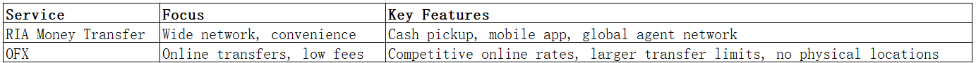 Differences: RIA emphasizes physical agent access and cash pickup, while OFX focuses on digital transfers with lower fees and high exchange rate transparency.