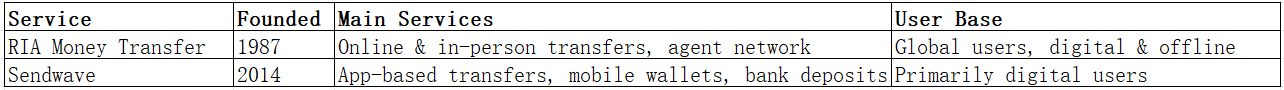 Differences: RIA Money Transfer offers both online and physical agent services, appealing to users who prefer in-person options. Sendwave is entirely digital, catering to users seeking app-based convenience with instant or same-day transfers.