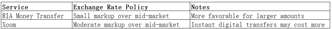 Exchange rates affect the total transfer cost. RIA typically applies a small markup on mid-market rates, while Xoom may include slightly higher markups for faster delivery.