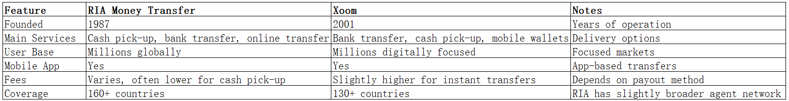 RIA suits users prioritizing broad agent networks and varied payout options. Xoom is better for users seeking instant digital transfers. For those valuing cost-effectiveness, speed, and fully online processes, PandaRemit may offer superior convenience.