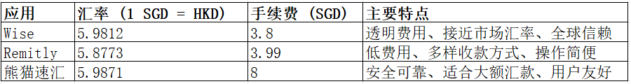 对于从新加坡到香港的大额汇款,选择安全可靠、费用合理的应用至关重要。Wise、Remitly 和熊猫速汇都是可靠选择,其中 熊猫速汇在安全性和用户体验上表现优异,尤其适合高价值转账。