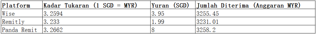 Perbandingan Kadar Tukaran dan Kos (Contoh: 1,000 SGD)
