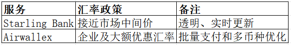 汇率直接影响到账金额。Starling Bank接近市场中间价,Airwallex针对企业及大额转账提供有竞争力汇率。