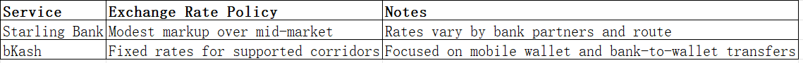 Differences: Starling Bank provides broader international coverage and full banking services; bKash focuses on mobile-first, regional remittances with easy cash-in/out options.