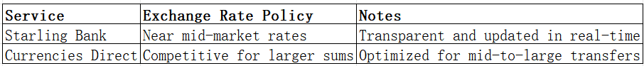 Exchange rates affect the total amount received. Starling Bank provides rates close to mid-market, while Currencies Direct applies competitive rates tailored for larger transactions.