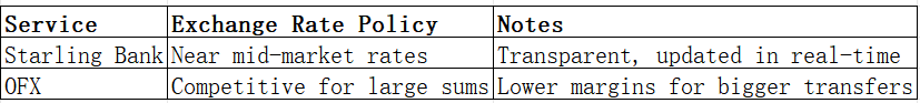 Exchange rates significantly affect the amount received. Starling Bank offers rates near mid-market, while OFX typically provides competitive rates for large transfers.