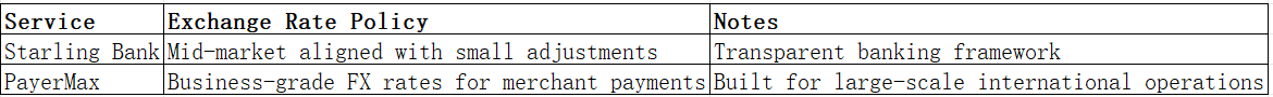 Exchange rate differences play a major role in total transfer cost. Starling Bank often offers competitive mid-market rates with minimal markups depending on the corridor. PayerMax applies FX rates aligned with merchant payments and global settlement structures.