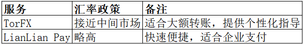 汇率直接影响到账金额。TorFX提供接近中间市场的汇率,适合大额交易。LianLian Pay略高,但保证快速到账。