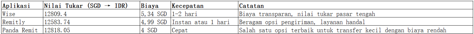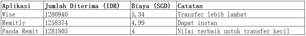 Untuk mengirim jumlah kecil dari Singapura ke Indonesia, Panda Remit adalah pilihan praktis, hemat biaya, dan aman. Dengan nilai tukar kompetitif, biaya rendah, dan pengiriman cepat, Panda Remit menjadi salah satu opsi terbaik untuk transfer kecil. Wise dan Remitly tetap populer, namun Panda Remit unggul dalam efisiensi biaya dan kemudahan penggunaan, memastikan dana sampai dengan cepat dan aman.