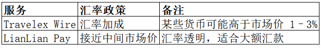费用结构:Travelex Wire 通常固定手续费较高;LianLian Pay 根据汇款金额和目的地浮动