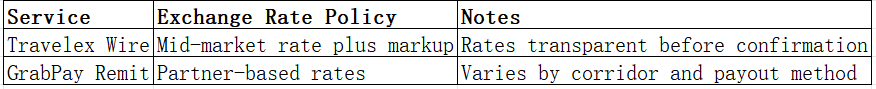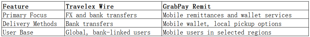 Travelex Wire is ideal for users needing broad currency coverage and traditional bank transfers. GrabPay Remit suits mobile users in supported regions seeking fast, wallet-based transfers.