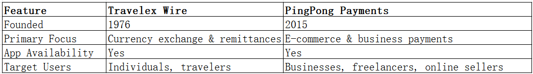 Travelex Wire is geared toward individuals and travelers, while PingPong Payments targets online sellers and businesses.