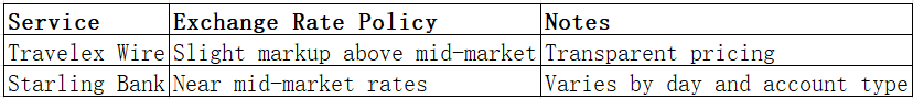 Starling Bank: Near mid-market rates for standard accounts, with minor markups possible during weekends.