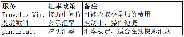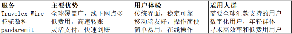 差异点:Travelex Wire以传统服务网络和全球覆盖著称,但费用可能偏高;驼驼数科侧重低成本、快速汇款,但覆盖区域相对有限。