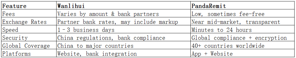 Wanlihui vs PandaRemit: Fees, Speed, Exchange Rates and Global Coverage