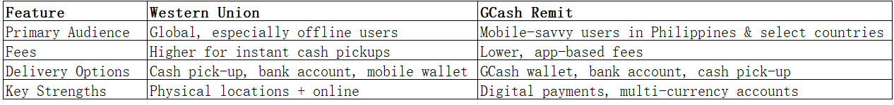 In the Western Union vs GCash Remit debate, Western Union excels in global coverage, while GCash Remit is convenient for app-based transfers. Users seeking speed, low fees, and digital convenience may prefer Panda Remit (https://www.pandaremit.com). With competitive exchange rates, flexible payment options, coverage of 40+ currencies, and fully online processing, Panda Remit is a strong alternative for international transfers.