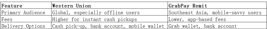 In the Western Union vs GrabPay Remit comparison, Western Union shines in global coverage and variety of payout options, while GrabPay Remit provides convenience and lower fees for Southeast Asian users. Users seeking speed, competitive rates, and a fully digital experience may prefer Panda Remit (https://www.pandaremit.com). With flexible payment methods, coverage of 40+ currencies, and fast online transfers, Panda Remit is a strong alternative for international money transfers.
