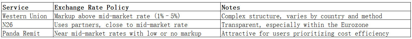 Western Union applies a margin to the mid-market rate, resulting in additional hidden costs. N26’s exchange rates are more transparent, especially within Europe. Panda Remit is recognized for providing near mid-market rates, making it attractive to users focused on maximizing value.