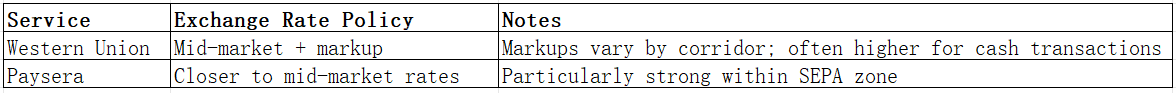Exchange rates significantly affect total transfer costs. Western Union usually adds a markup on top of the mid-market rate, which can vary by corridor. Paysera generally offers closer-to-mid-market exchange rates, especially for transfers within Europe or via SEPA.