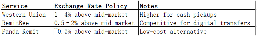 Exchange rate markups are a critical factor in international transfers. Western Union typically charges 1–4% above the mid-market rate, depending on the corridor. RemitBee offers more competitive rates, usually 0.5–2% above the mid-market rate. Panda Remit maintains low markups, often closest to mid-market rates. The table below summarizes the exchange rate policies: