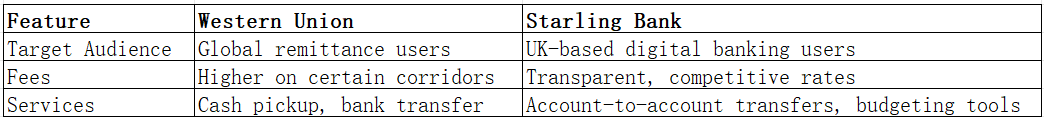When evaluating Western Union vs Starling Bank, both offer strong international money transfer services, but they differ in cost, speed, and user focus. Western Union excels in global reach and cash pickup, while Starling Bank is a transparent, tech-forward banking solution.