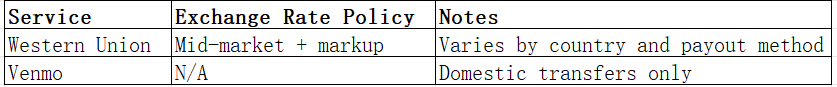 Western Union applies a markup on mid-market rates, which can vary by corridor. Venmo does not provide foreign exchange, as it is U.S. domestic only.