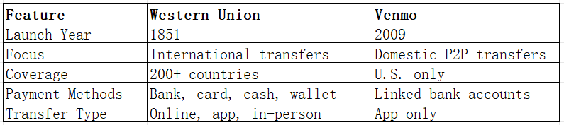 Differences: Western Union is international and supports cash pickups; Venmo is domestic-only, focusing on app-based bank-to-bank transfers in the U.S.