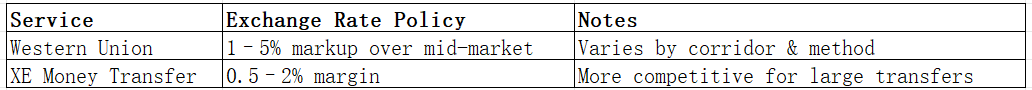 Western Union typically adds a 1–5% markup above the mid-market rate. This markup varies by country and delivery method, and in-store rates can differ from online rates.