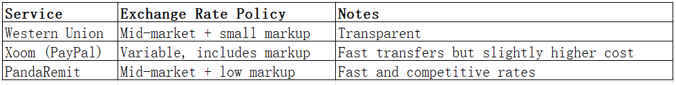 Western Union uses mid-market rates with slight markup, providing transparency. Xoom (PayPal) may include additional markup on international transfers.
