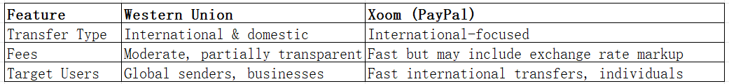 Western Union charges fees based on the transfer amount and destination, with partial transparency. Xoom (PayPal) provides faster transfers but may include higher exchange rate markups.