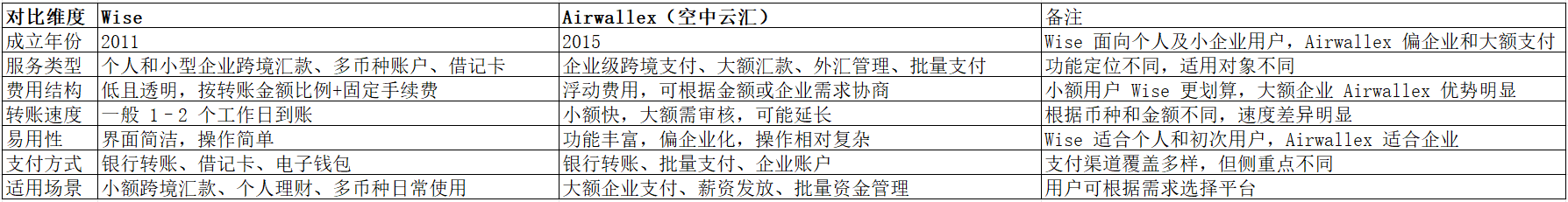 用户体验不同:Wise 界面简洁,Airwallex 功能更丰富、偏企业化