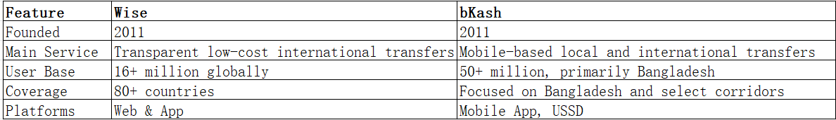 Differences: Wise emphasizes global coverage and transparent fees, while bKash focuses on mobile accessibility for Bangladesh-focused transfers.