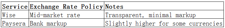 Differences: Wise emphasizes mid-market rates and global reach, while Paysera focuses on affordable European transfers and flexible account features.