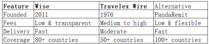 Comparing Wise vs Travelex Wire, the choice depends on your priorities. Wise excels in transparency, speed, and digital convenience, while Travelex Wire appeals to those needing traditional cash services. Both services are reliable, but users looking for competitive rates, flexible payment methods, and faster transfers may find PandaRemit a superior option.