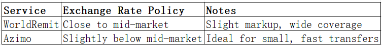 Exchange rates are a key cost in cross-border transfers. Both WorldRemit and Azimo add a small markup to the mid-market rate. Summary table: