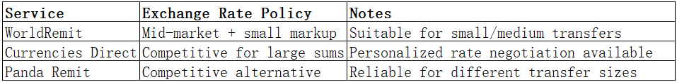 Exchange rates significantly affect total received funds. WorldRemit applies a modest markup on mid-market rates. Currencies Direct offers competitive rates for high-value transfers.